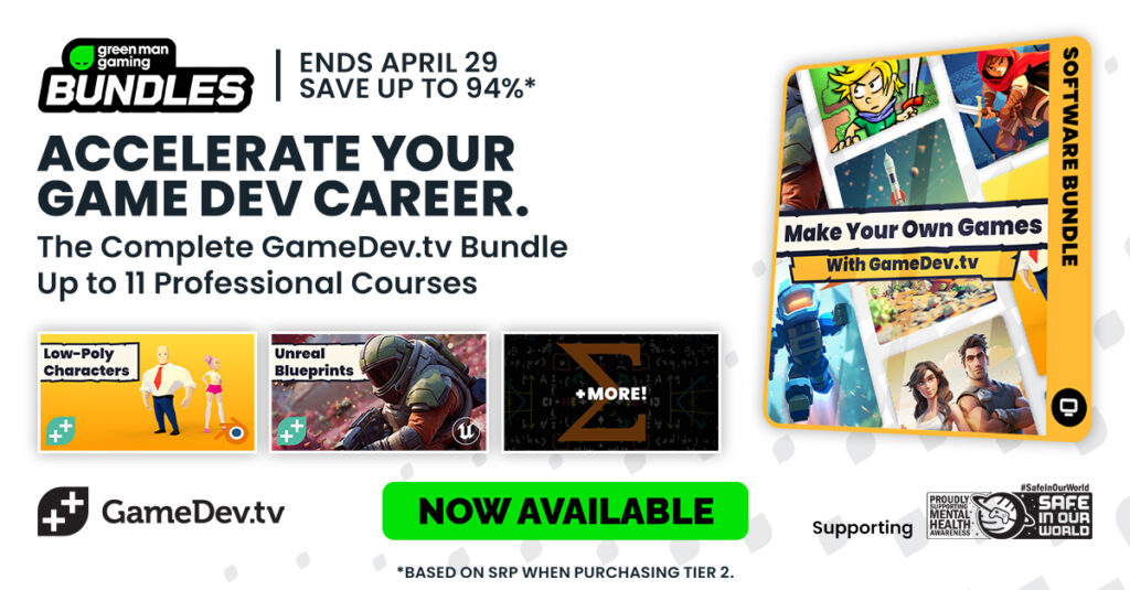 Expanding Green Man Gaming’s charity bundles platform to offer productivity, creativity and professional development software, the GameDev.tv Bundle launches today in support of Safe In Our World, offering Unity, Unreal, Blender, Godot and more to help budding developers make their dream game